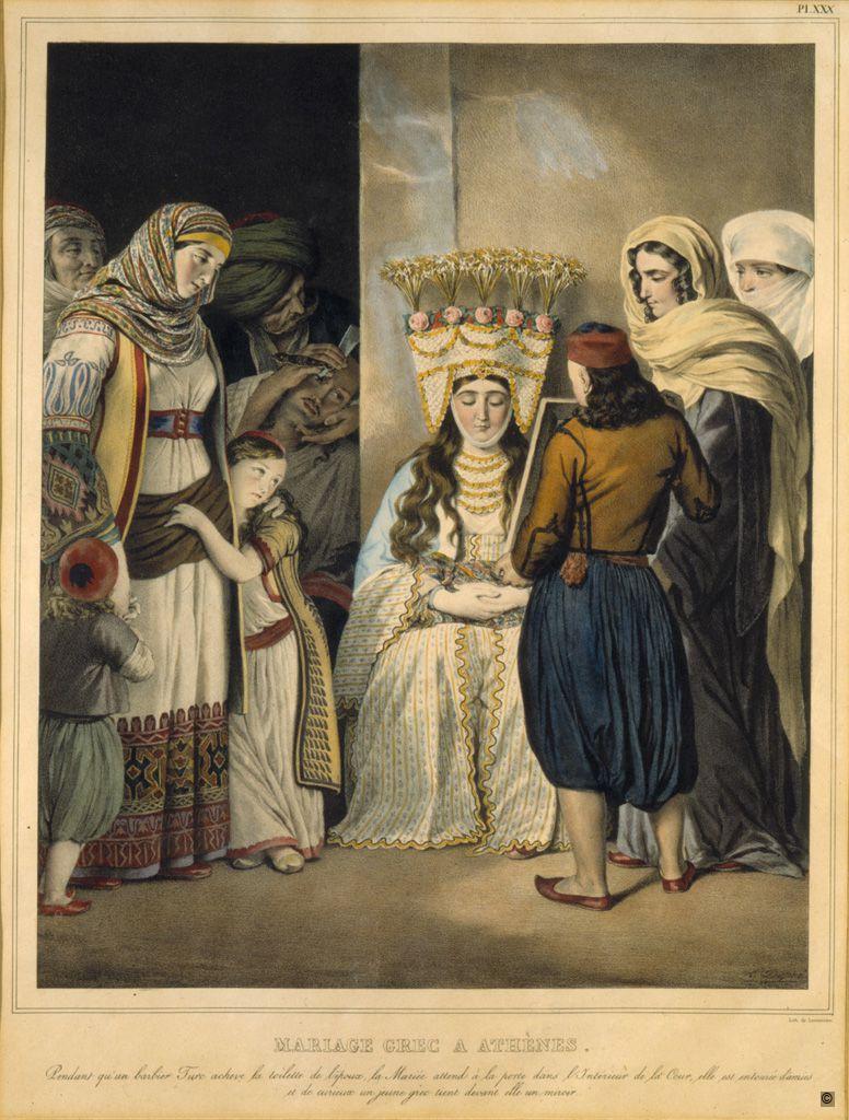Louis Dupré (1789–1837) visited Greece in 1819. He exhibited Greek subjects at the Salons of 1827, 1831, 1833 and 1855. In 1825 he published a set of colored lithographs of views and studies of costumes from Greece, entitled Voyages à Athènes et Constantinople. Dupré recorded his experiences of travel in the Levant in 1819 mainly through portraits of the people he met. In addition to the lithographs in this book, Dupré also produced loose broadsheet lithographed plates. Many of these are in the possession of the Cabinet des Estampes of the Bibliothèque Nationale. Much has been written on Dupré. Athenian Bride depicts the preparations of an Athenian wedding. The bride patiently waits as the groom is ritually shaved.