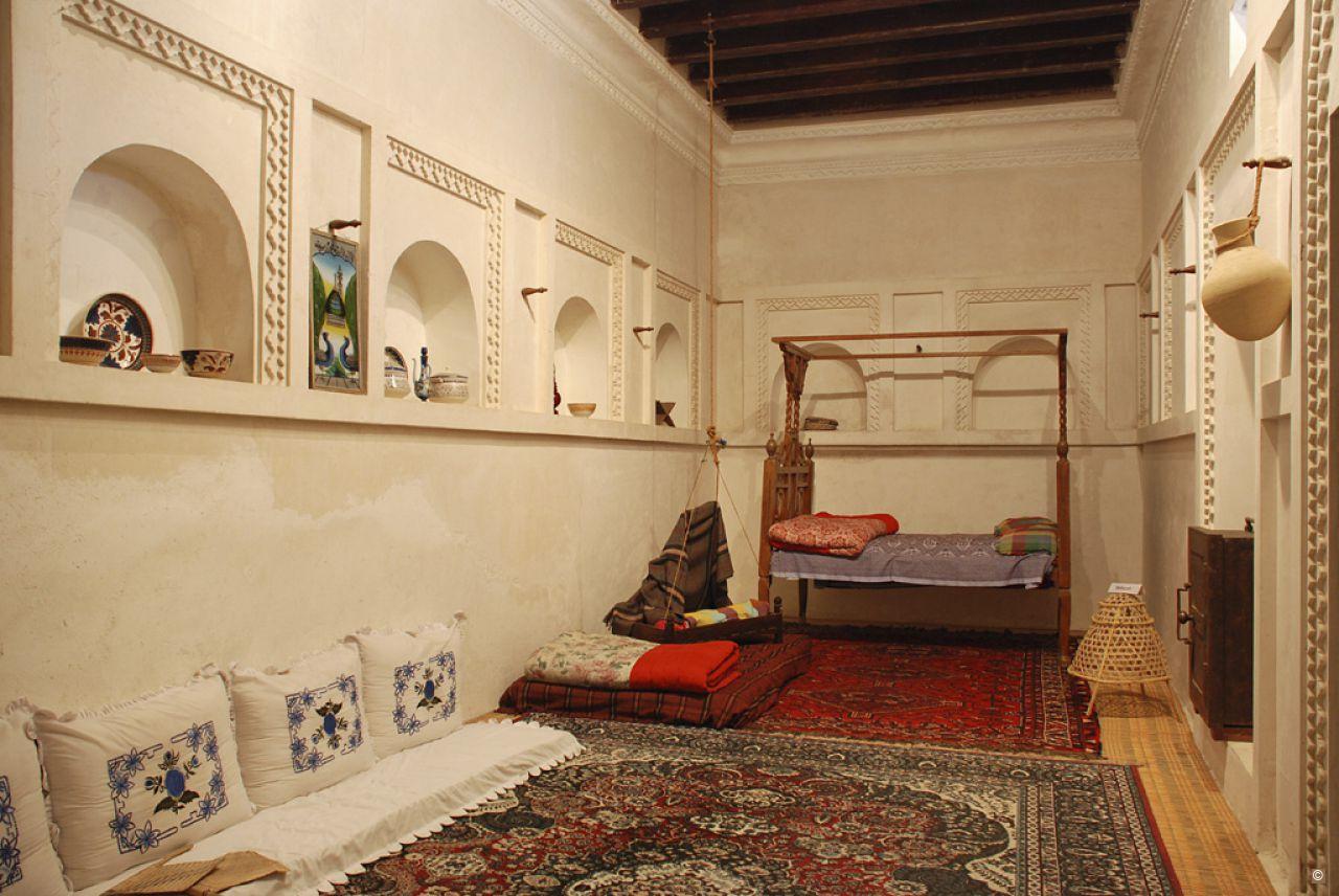 This house at the heart of historic Sharjah belonged to 'Obaid bin 'Isa bin 'Ali Al Shamsi, who was also known as al-Naboodah. He was a well known pearl merchant with good connections to foreign countries such as India, East Africa and France. The house was originally built by 'Obaid's father Essa in 1845, and 'Obaid resided here with his three wives and ten children. Later it passed to his grandchildren, who lived in it till the 1970s. The double-storey house covers an area of 1280 square meters and is built around a large courtyard. Unusually, the kitchen annex with its well and the main reception area (majlis) are conceived separately from the main building arrangement. Family rooms and toilets are found on both floors, the first floor rooms preferably used in the summer, as they were cooler and airier than those on the ground floor. Enclosed rooms have high ceilings for the heat to rise and escape. Decoratively carved gypsum screen separate the rooms from washing areas. The house was carefully restored in the 1990s and now gives an excellent impression of the multiculturalism of traditional Sharjah architecture, as it combines local materials such as coral and lime mortar (jus) with red silt clay (sarooj) from Iran and hard woods from Zanzibar and East Africa.