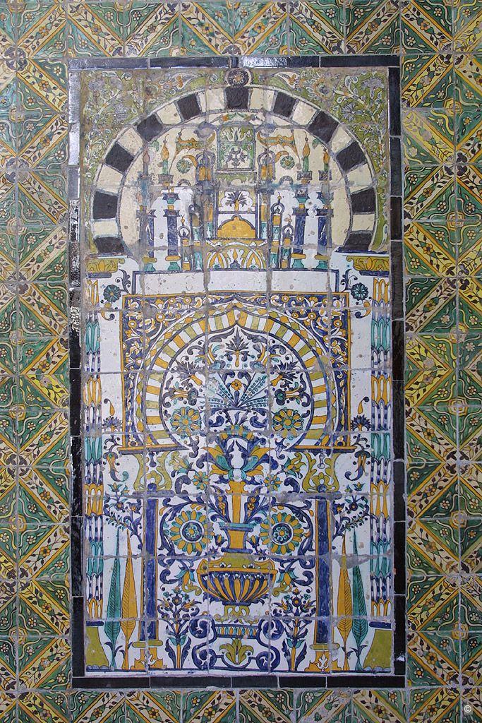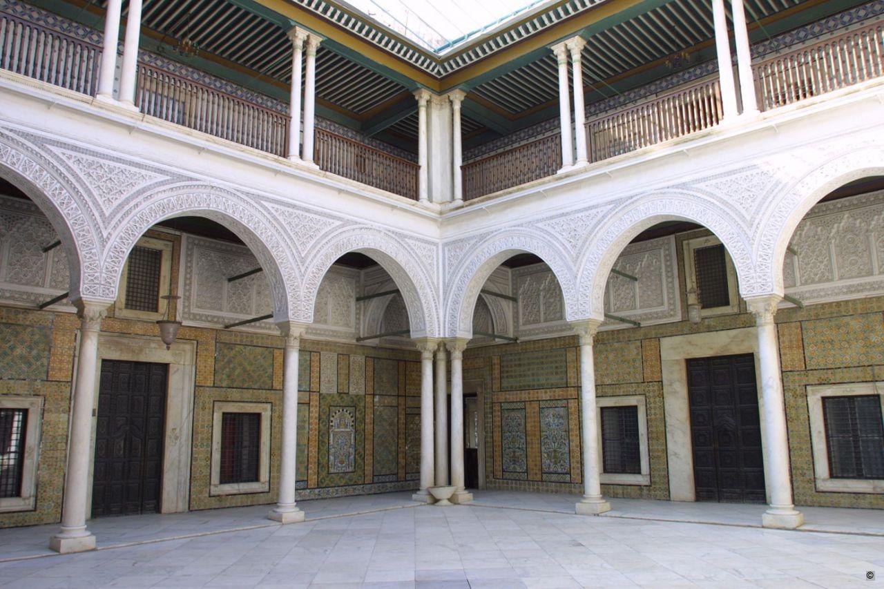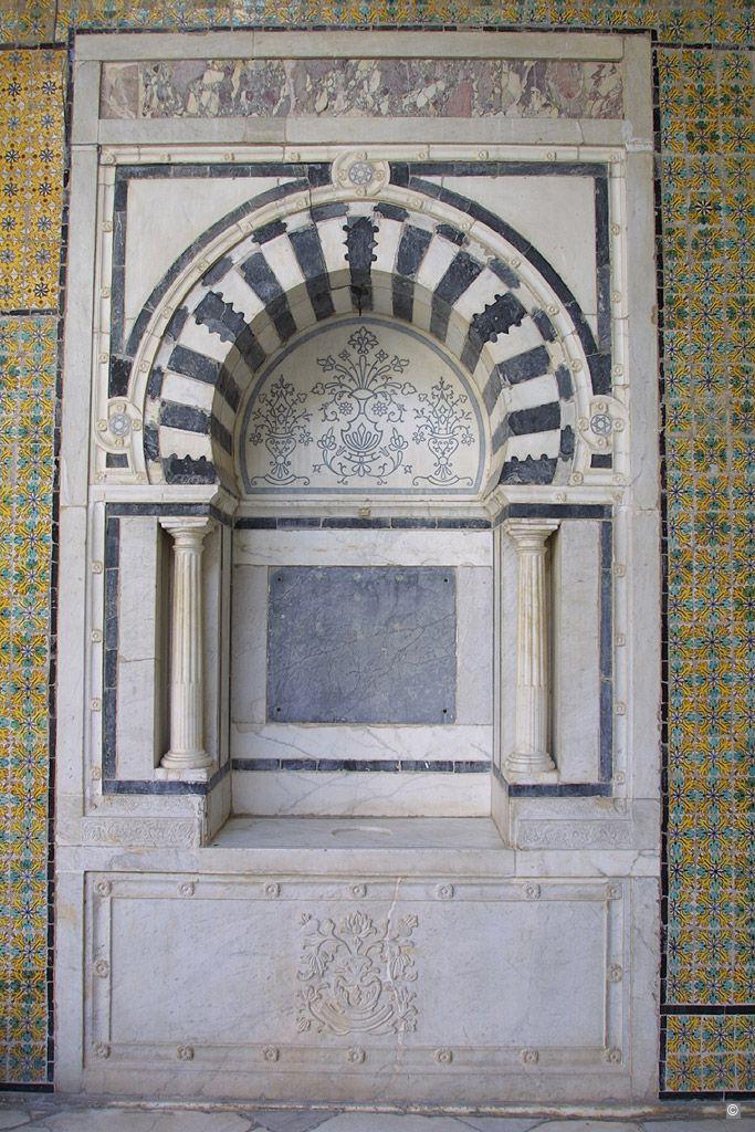 Dar Hussein, one of the most beautiful palaces of the Tunis medina, shows traces of all the different eras of Tunisian architecture, from the Khorasani era through the Andalusian, Turkish and colonial eras. On the ground floor, four large rooms, including a great hall, surround a peristyle. The neo-corinthian capitals topping the columns were made by Italian sculptors. On the first floor there is an elegant second peristyle in a 19th century Italian style, The galleries are divided up into four apartments, decorated with frescoes painted on faience pottery beneath a frieze of carved plaster.