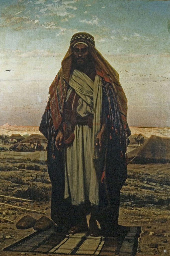 Stefano Ussi lived between Florence and Rome and studied at the Academy of Fine Arts of Florence before enrolling as a volunteer in the first Italian War of Independence, during which he was taken prisoner by the Austrian troops. He developed a model of history painting characterised by a quick application of layers (almost a rough draft) and by a sharp chiaroscuro. In 1875, along with the painter Cesare Biseo, and Edmondo De Amicis, he accompanied an Italian diplomatic delegation to Morocco. At the opening of the Suez Canal the artist went to Egypt and created his first version of The Prayer in the Desert which is exhibited at the Accademia di Belle Arti in Florence. From that moment on, Ussi made both history and oriental-themed paintings.