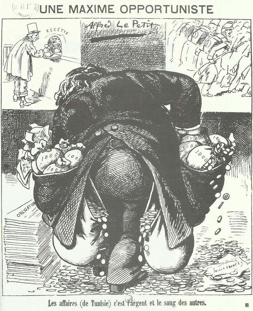 Caricature de L’Epoca du 1er-2 août 1881, journal satirique, critiquant l’intervention française en Tunisie. Le consul général de France en Tunisie, Théodore Roustan, est représenté comme le nouveau maître de la Tunisie, sous le titre “Son Altesse Roustan Ier”, le consul tenant en laisse le bey régnant Sadok Pacha Bey.