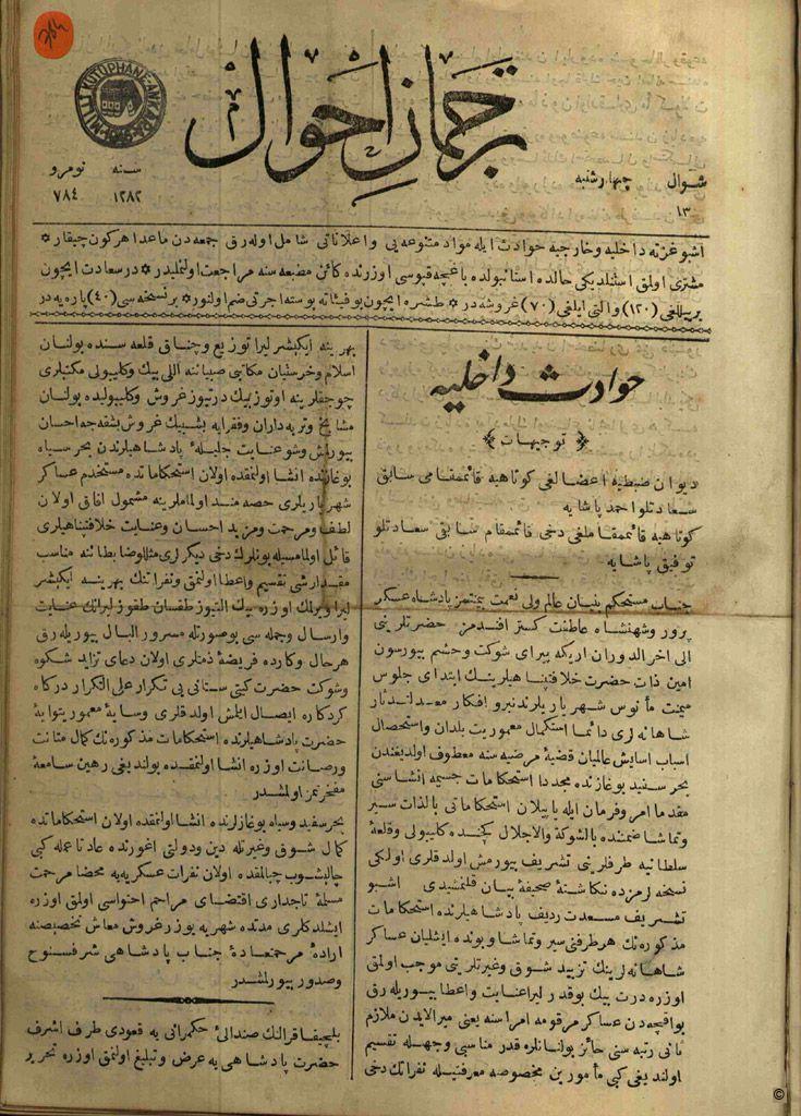 Tercüman-ı Ahvâl was the first private newspaper published in Istanbul. It was produced between 1860-1866 by Agah Efendi and Şinasi, men of letters of Tanzimat Era. Initially it was published only on Sundays, but starting from the 25th issue in 1861, it was published three times a week. Leading authors of the period such as Ahmed Vefik Paşa, Ziya Paşa and Refik Bey frequently wrote for it, discussing the reasons for the backwardness of Ottoman society and current events. In the paper, works of literature were also published. For instance the first Turkish theatre play, Wedding/Marriage of the Poet, by Şinasi (1860) was published as a series. The paper was closed for two weeks in 1861 after a very critical article probably written by Ziya Paşa. This is regarded as the first example of a ban in Turkish press. The paper was no longer published after 11 March 1866.