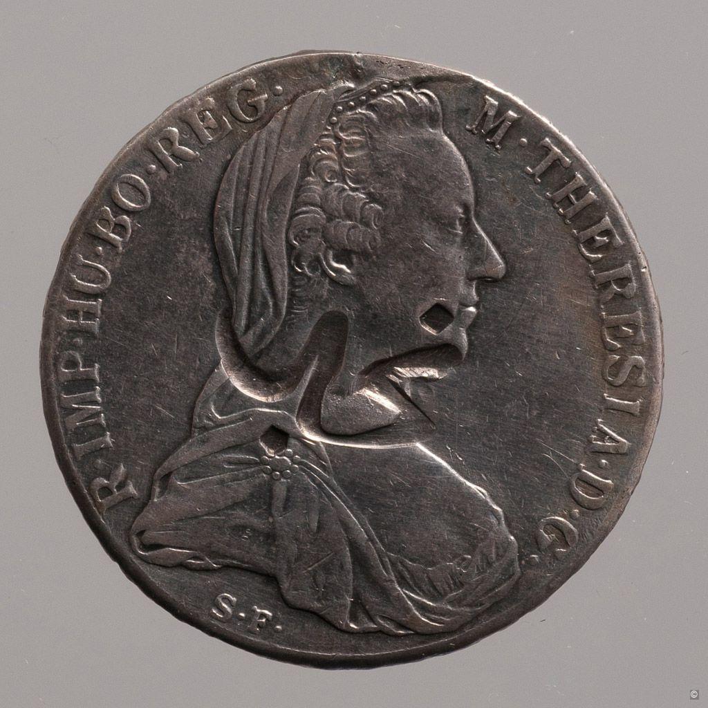 The Maria Theresian Thaler, a large silver coin originally created by Queen (Empress) Maria Theresia, minted in Austria until 1890. It was used in the Arabic Peninsula as a means of payment. This coin was countersigned at the Arabian mint of Ras Bab el Mandeb in 1890.