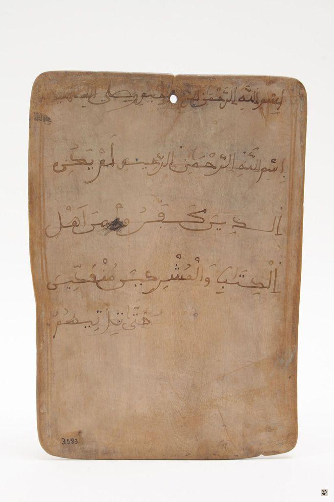 Qur'anic board used in the African madrasas (schools), places where the first verses of the Qur'an are learned, under the direction of the marabout (teacher). The learning method consists of copying and reciting the different verses of the Qur'an, in a process of memorisation, which allows the students to erase them and then to write the following verses. The alluha (table of wood), the reed, and the ink are the only available pedagogic materials of the Qur'anic schools in the rural areas. The Qur'anic boards turn into documents that preserve the written personality of those who used them, the irregularity of the letter, the crooked lines, the hesitations, the corrected mistakes, the erased lines that refuse to disappear, as a register of a period of effort and domain of skills typical of the school stage.