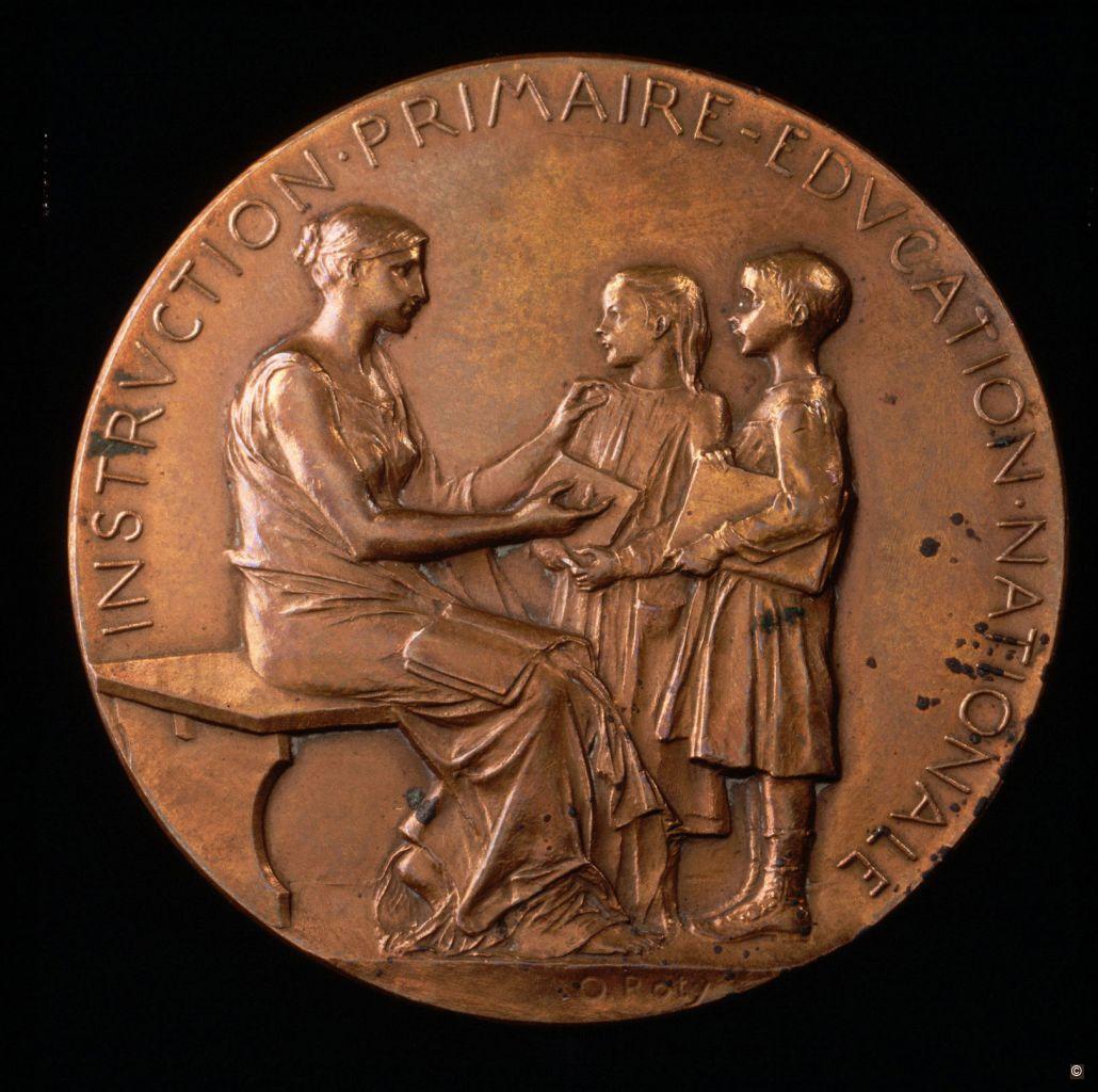 The engraver Oscar Roty was famous for his image of "La Semeuse" (the sower), which was stamped on French coins. This symbolic medallion, depicting two young students, pays tribute to Jules Ferry's education laws, which introduced free, secular and mandatory primary schooling for girls and boys.