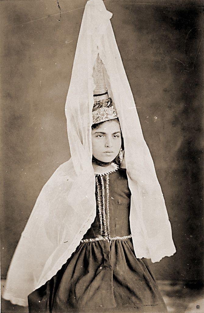 The bride wears a tantur, a head ornament worn along with a white veil by the women from Antilibano. The photo belonging to Enrico H. Giglioli's collection was collected by the Florentine naturalist on his world travels in 1865 to 1868 as he advanced diplomatic and commercial affairs between the newborn Italian state and the other nations. The images seem to have been created spontaneously to show ethnocentric diversity. The ethnographic photographs in the Giglioli's collection are part of the historical archive of the Pigorini Museum and are important for the histories of anthropological science and photography. The origins of scientific activity and conservation of Museo Nazionale Preistorico Etnografico "Luigi Pigorini" in Rome can be traced back to the 1875 foundation of the "Royal National Museum of Prehistory and Ethnography in Rome" within the buildings of the Roman College.