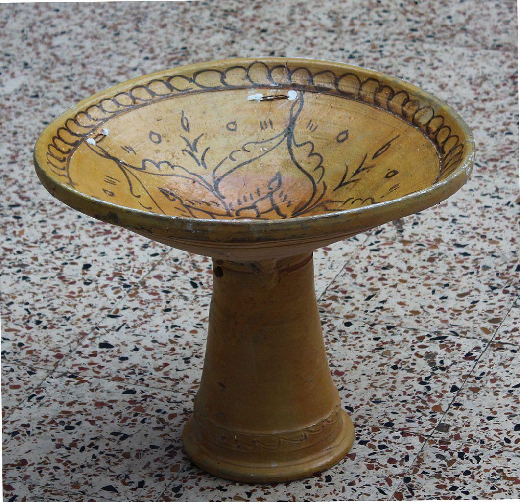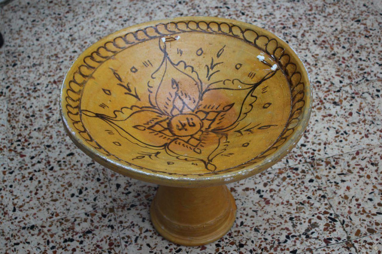 This bowl with a bulging rim sits on a stand. The decoration is made of two layers of concentric patterns around a central circle, filled with winged motifs. These green and brown patterns are painted on a yellow background. Although this kind of bowl is usually used to serve couscous, in the town Nabeul, and particularly for the occasion of Islamic New Year, each child is presented with a methred bowl, filled with golden couscous, dried fruit, dates, a hard-boiled egg and sweets. This all surrounds a statuette made of sugar, moulded and coloured to resemble an animal (such as a rooster or a gazelle) or a figure, like a doll or cavalier.