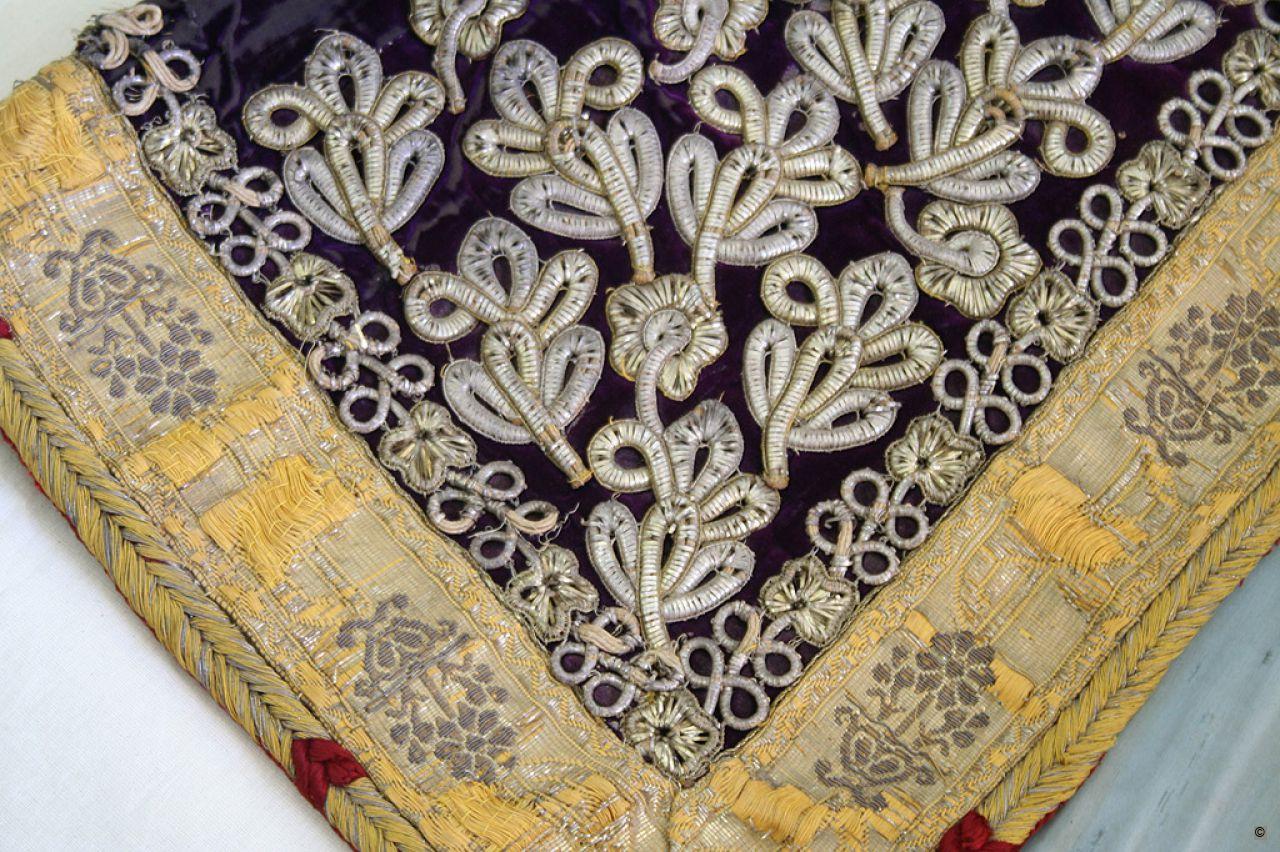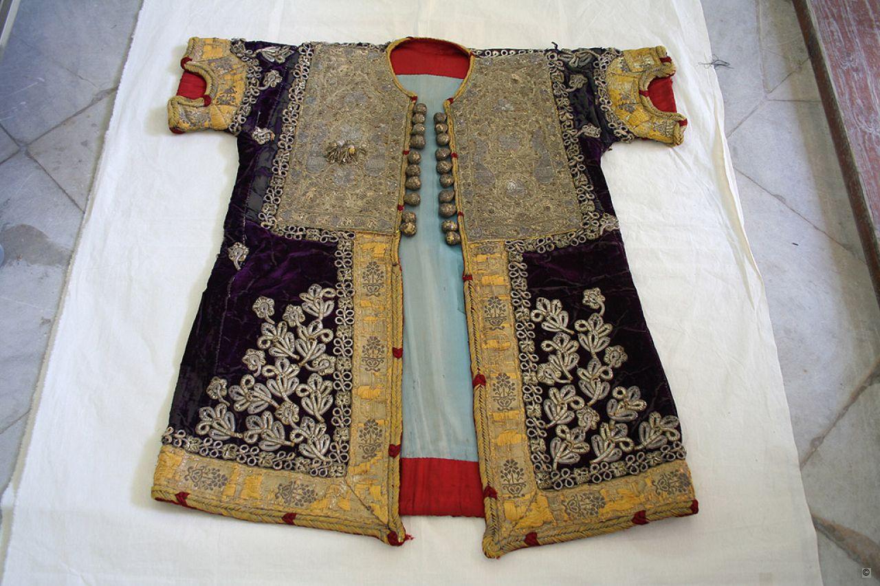 This purple velvet kaftan is decorated with gold and silver braided trimmings and embroidered with silver and golden metal thread. It is fitted with mid-length sleeves embellished with a large "lyonnais" ribbon. The chest is covered by a large breastplate, split into two symmetrical halves, and adorned with large buttons of gold lace. The embroidery on the breastplate features two peacocks facing, on each side, a bowl with floral motifs. The kaftan is lined with a pale blue satinette on the outer rims with a pattern of swallows' wings sewn on. The kaftan, a particularly lavish item in the 19th century, was typically worn for marriage ceremonies, usually with calf-length trousers.