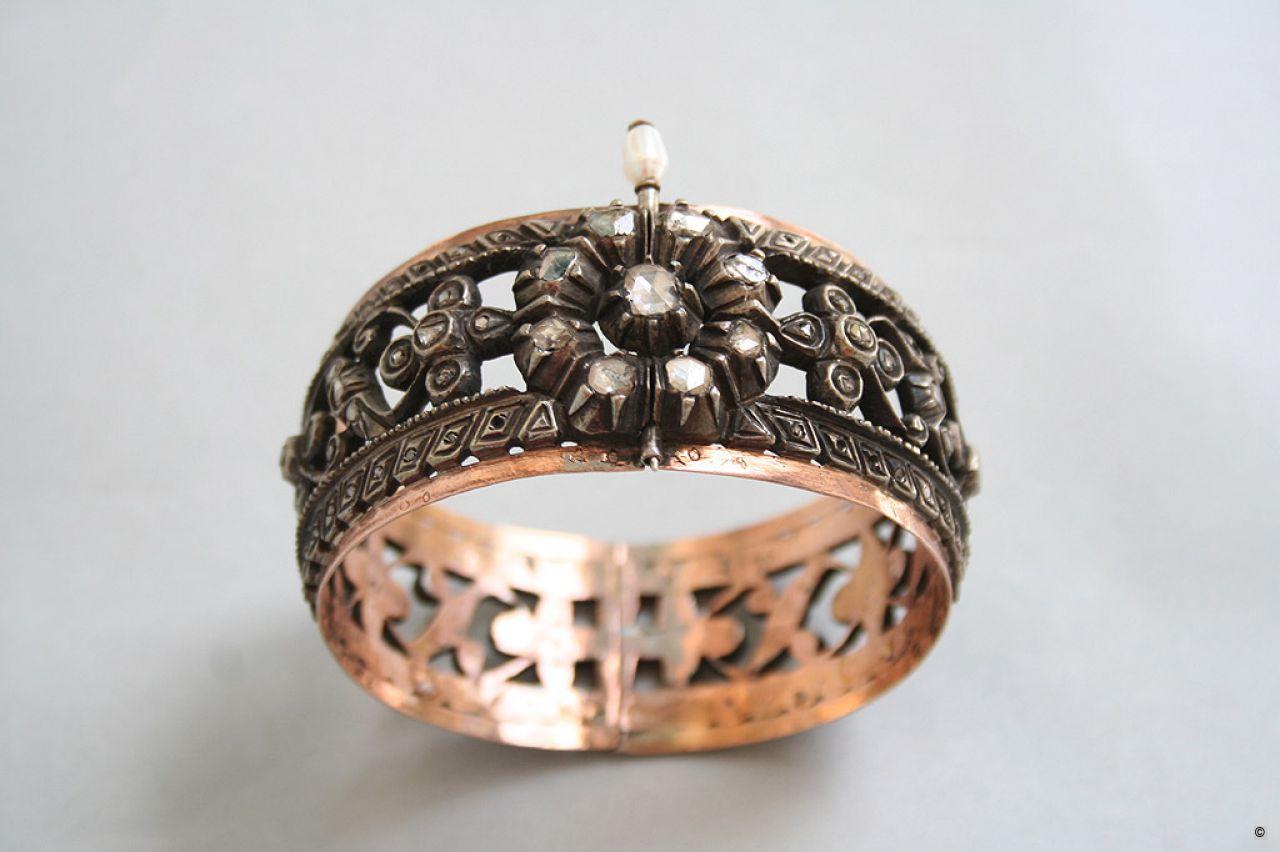 This silver bracelet, which is lined with gold and encrusted with roses, is made of a longer chain of openwork rosettes and framed by geometric motifs. A jagged gold leaf lines the inside of the bracelet. All the silver motifs are encrusted with roses. The two identical halves of the bracelet are joined by hinge and pin fastening topped by a large pearl.